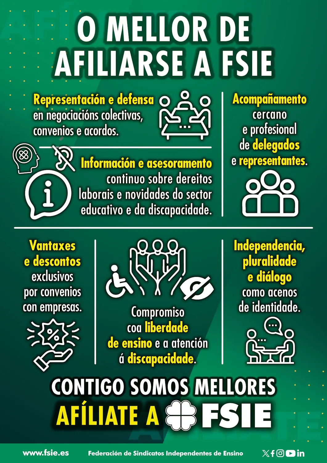 Antes de nada, comezaremos por darche a benvida e agradecerche a túa decisión de afiliáreste a FSIE, organización sindical na que esperamos atoparás o que andas a buscar como traballador/a que es do sector da ensinanza privada.